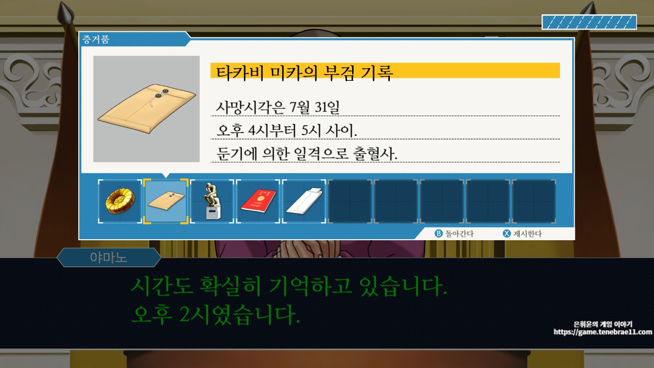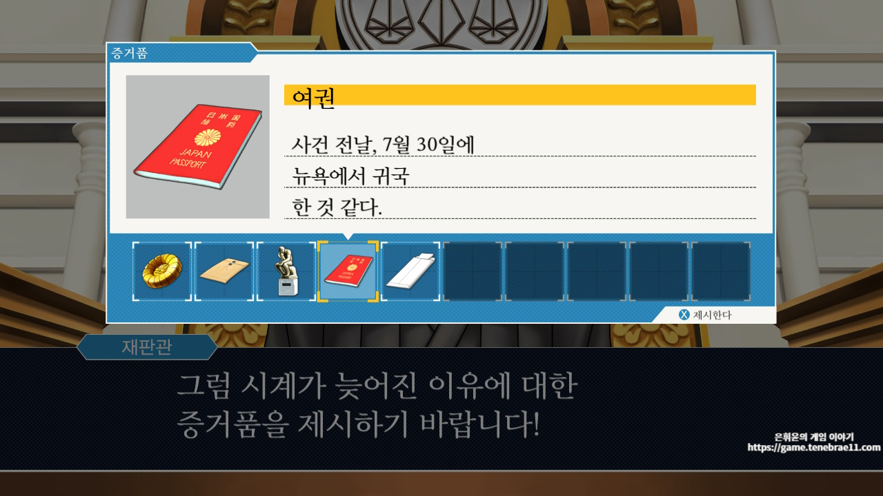 안녕하세요. 은휘윤입니다.해당 포스팅에서는 역전재판 1 두번째 에피소드 역전자매 1일째 탐정편의 공략을 다루고 있습니다.오직 클리어만을 위해 제공되는 공략으로 스토리를 최대한 배재하