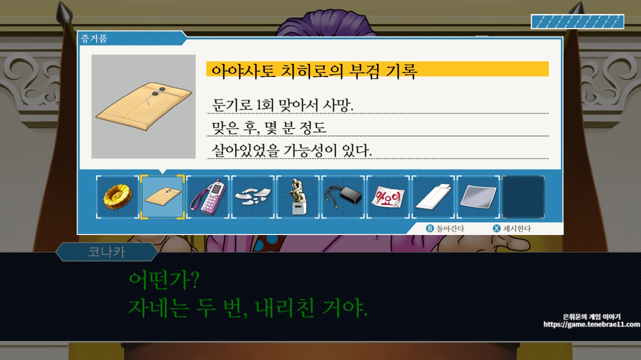 해당 포스팅에서는 역전재판 1 두번째 에피소드 역전자매 최종일 법정편의 공략을 다루고 있습니다.
