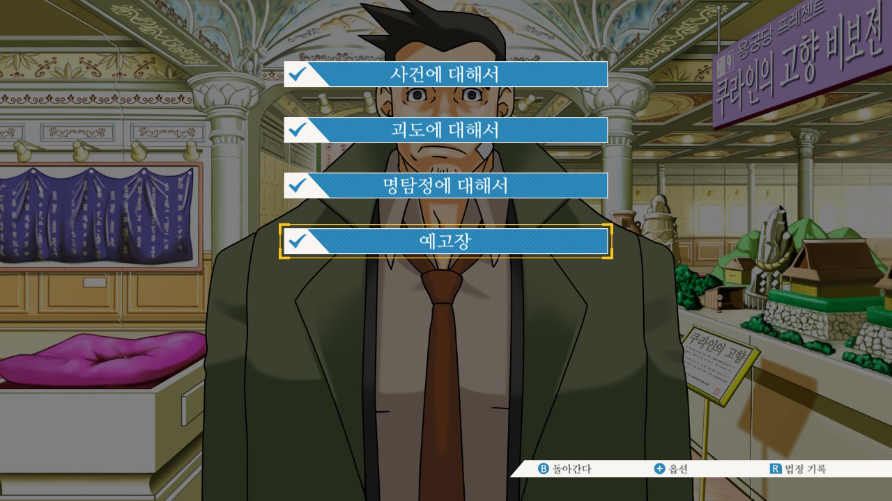 | [역전재판3] 제1화 추억의 역전 (2) 제1회 법정 / 후편 (0) | 2024.10.22 |