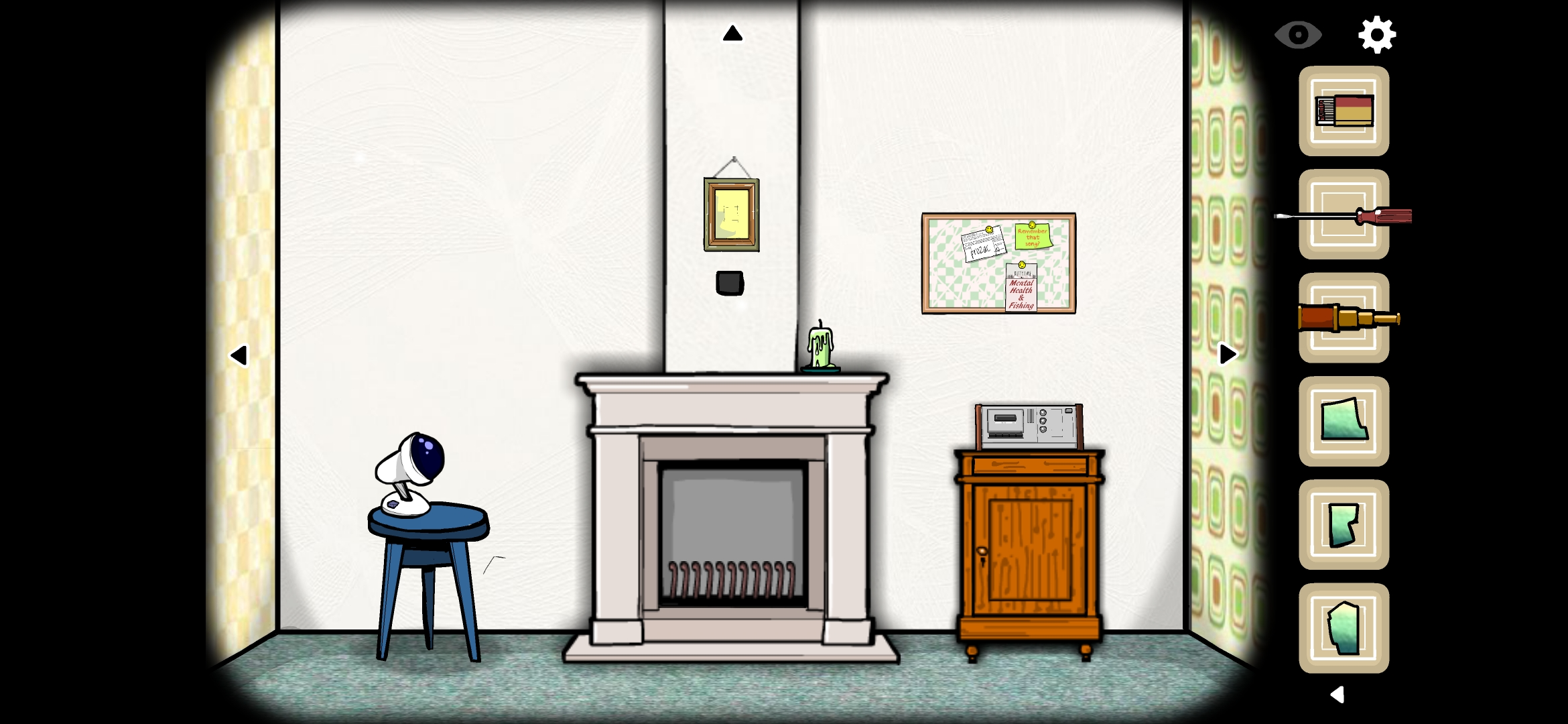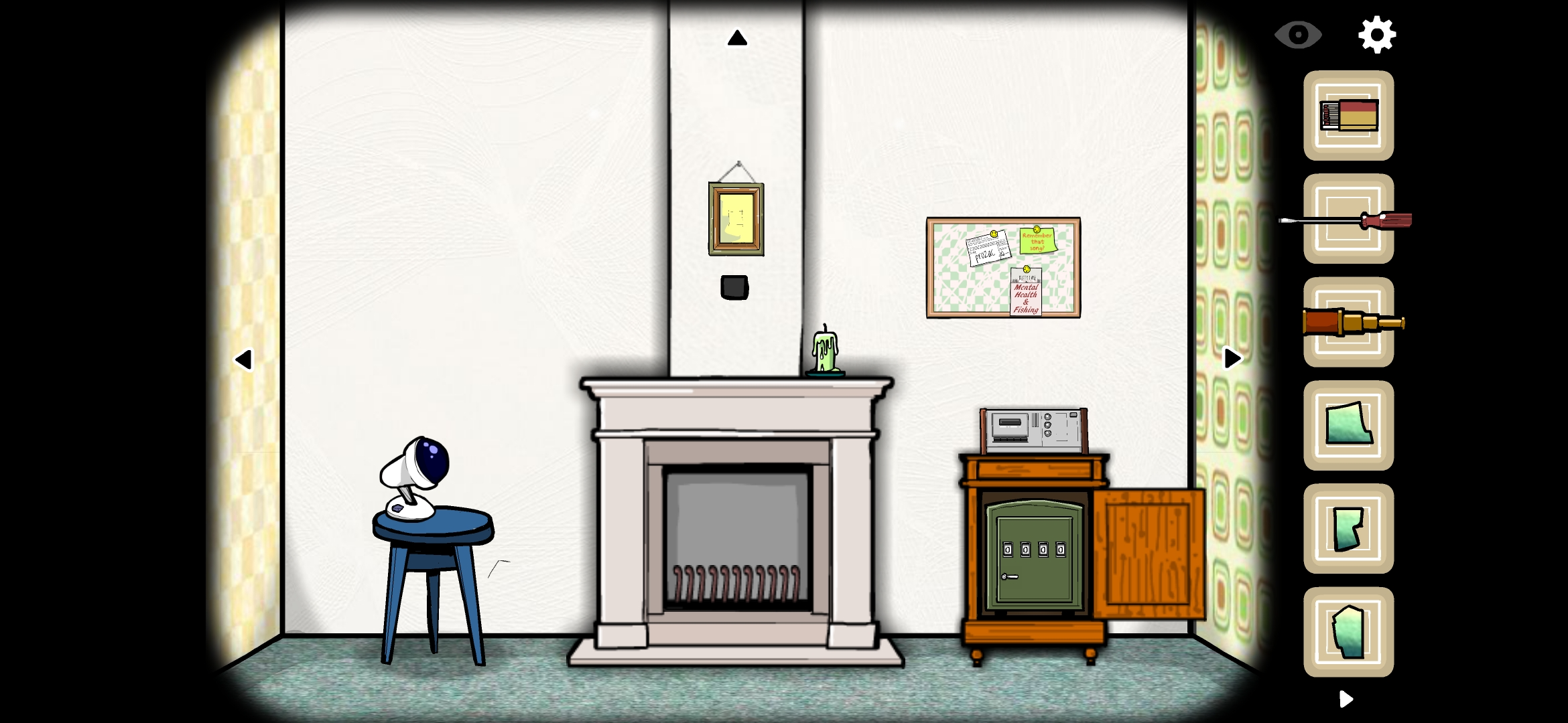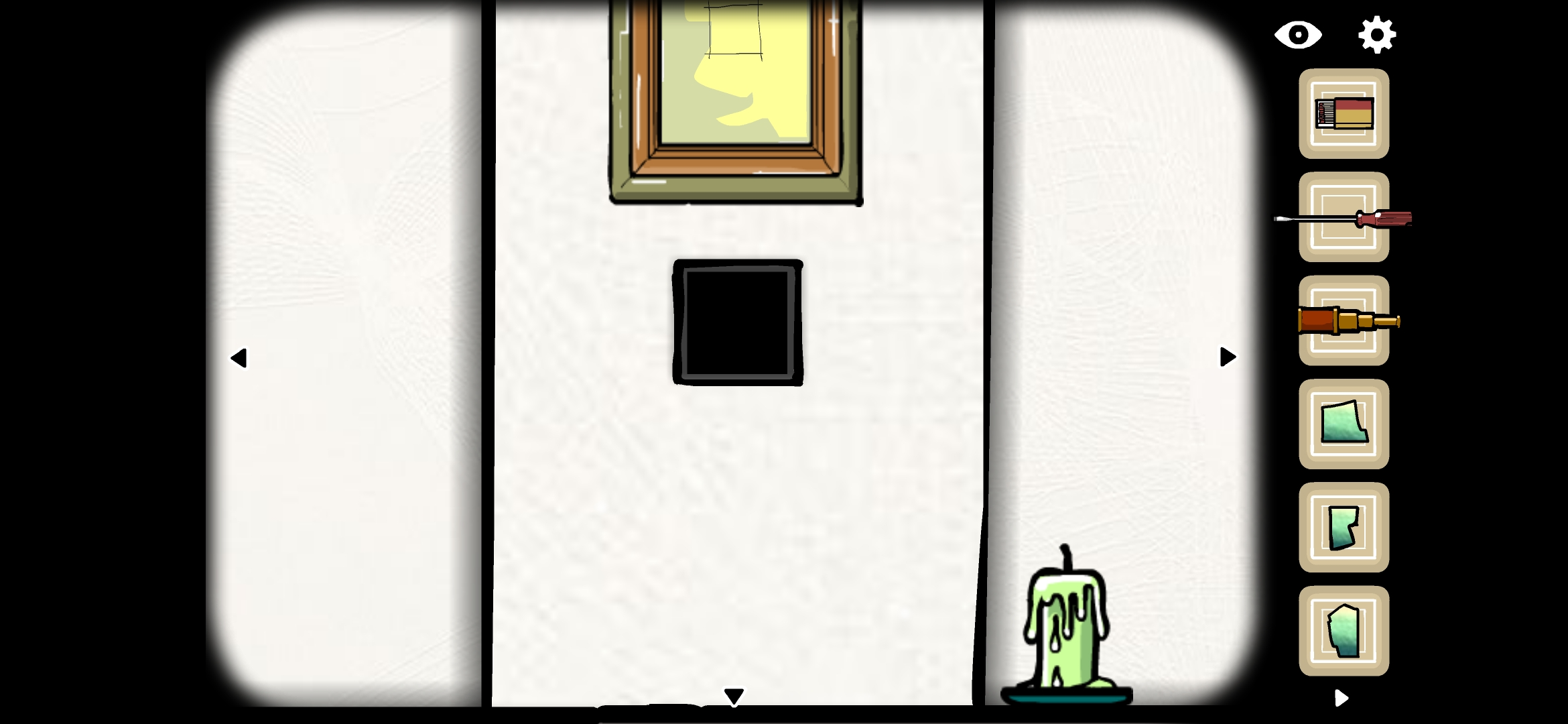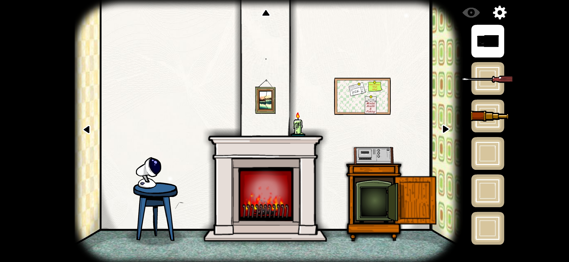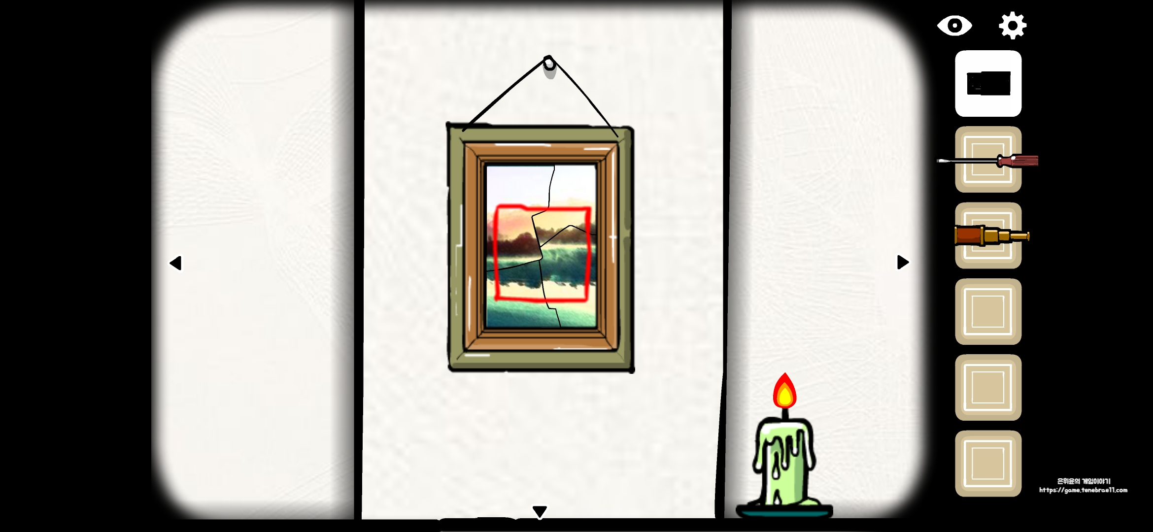 액자 아래 빈 공간에 큐브를 넣고 엉킨 테이프와 성냥으로 난로에 불을 붙여줍니다.