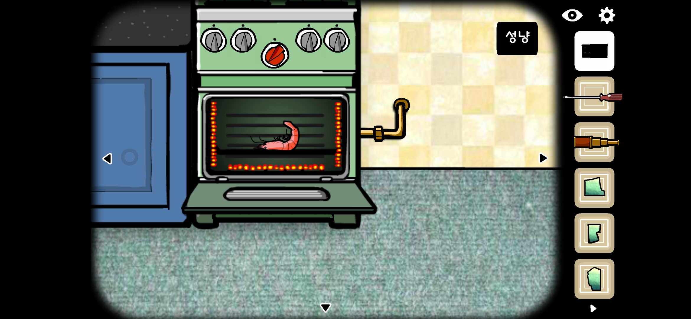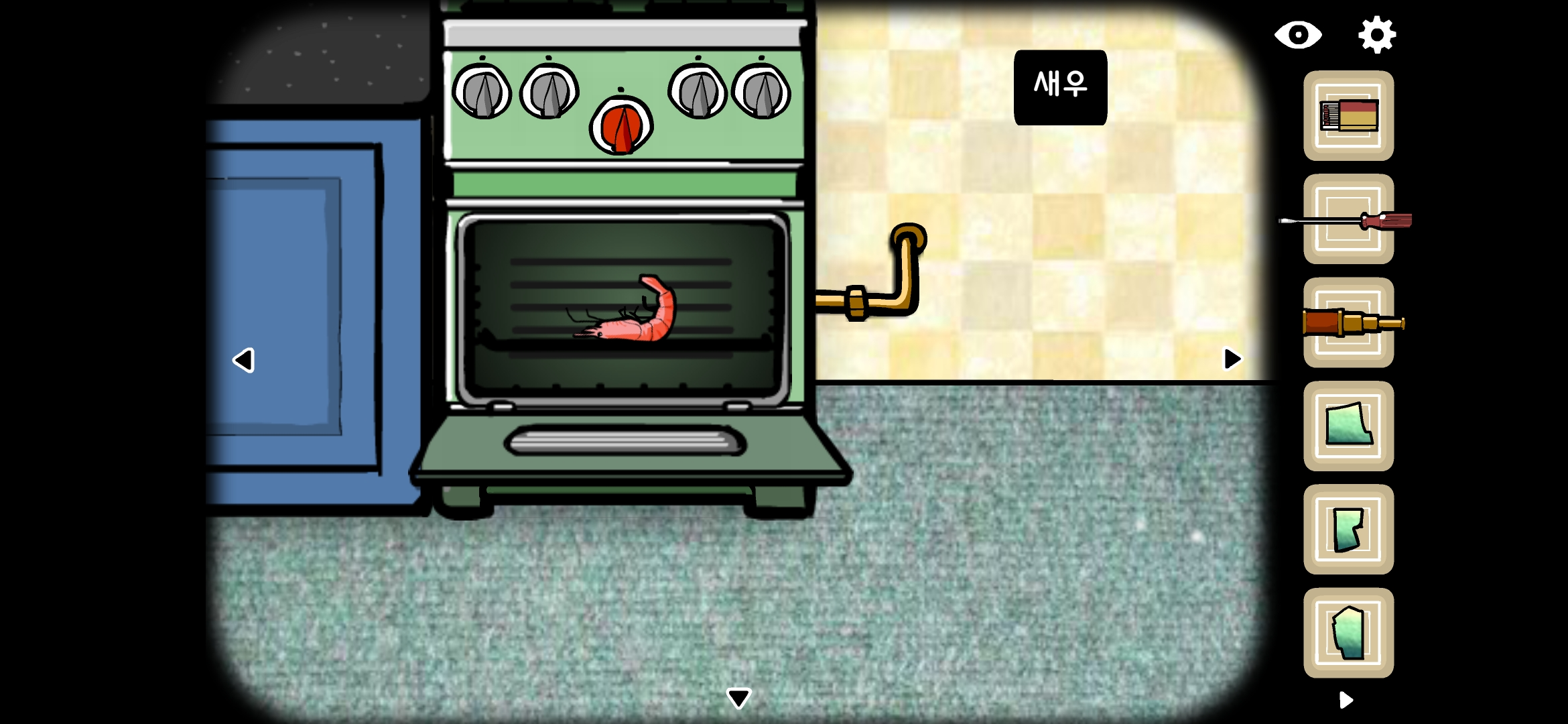 주방으로 가서 드라이버로 오븐을 열고 오븐 안에 새우를 넣어 구워줍니다.